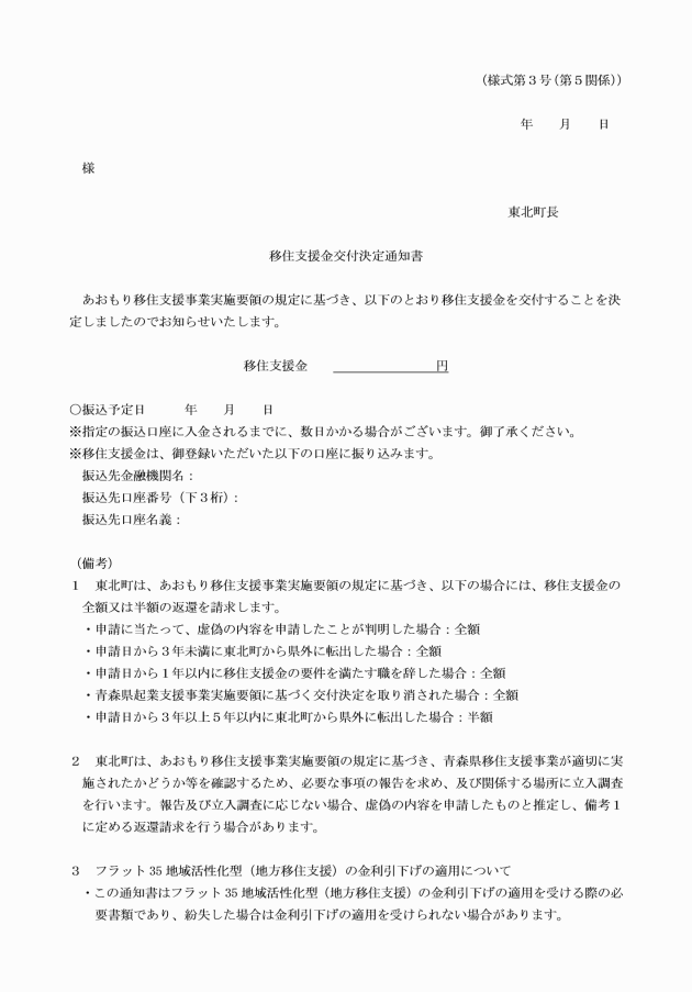 第5 町長は、前項の申請があったときは、その内容を審査し、移住支援金を交付することが適当と認めるときは、速やかに交付決定通知書(様式第3号)により、当該申請者に通知する。